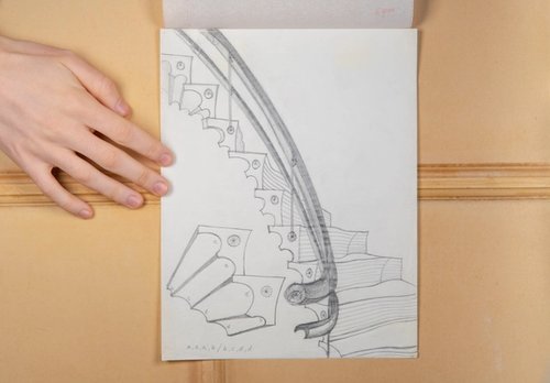 This archival display takes the Moonwell – a somewhat hidden part of the house – as its starting point. The Sun and Moon are key symbolic counterpoints in The Cosmic House: the Sun as source of energy and power, the Moon its mystical, shifting counterpart. This duality plays out between the Solar Stair, described by Charles as ‘the physical and psychological centre of the house’, and the Moonwell, its lunar and conceptual satellite. On axis with the Solar Stair, the Moonwell is a semi-circular shaft with its mirrored surfaces creating the illusion of a circular well of light that illuminates an otherwise dark area of the house. Where the Solar stair draws on the rhythms of the solar year, the Moonwell reflects the phases of the moon.